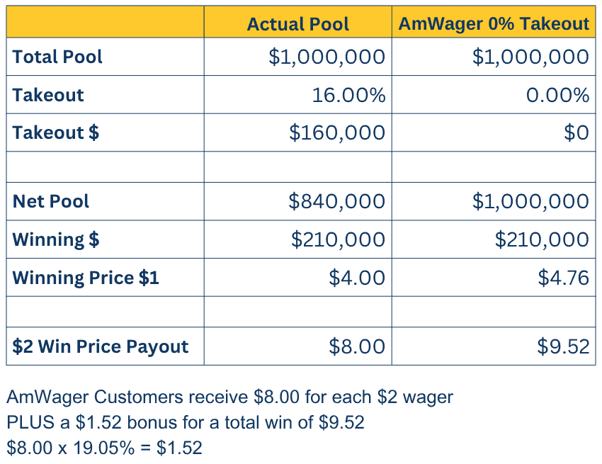 AmWager then recalculates the WIN pool payout using a 0% takeout.